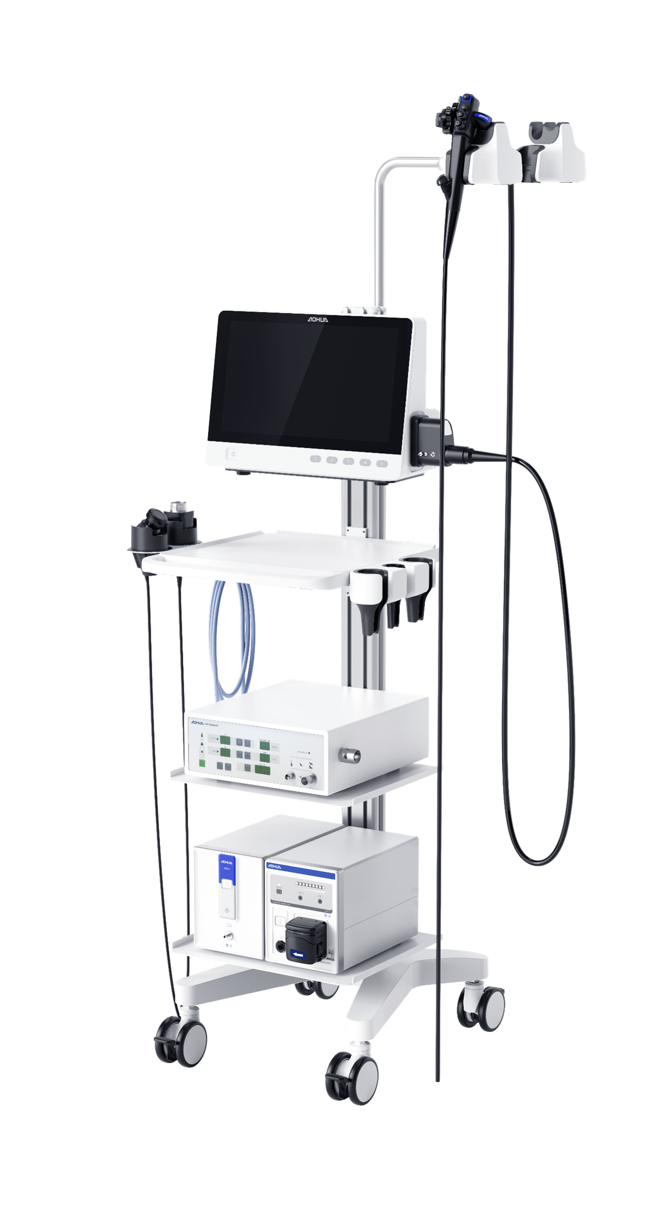 Endoscope pole assembly holds up to 2 flexible endoscopes.