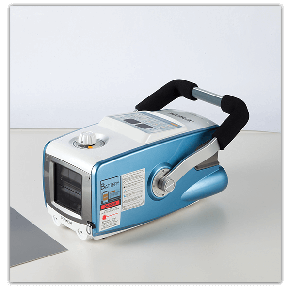 It is newly designed with innovative microengineering and battery technology for equine veterinarians, specially for female doctors. Weighing less than 15 lbs and a dual laser focusing on the center of X-ray film at 26” preset SID, VET-20BT is the lightest, smartest and most durable X-ray unit in the portable market.